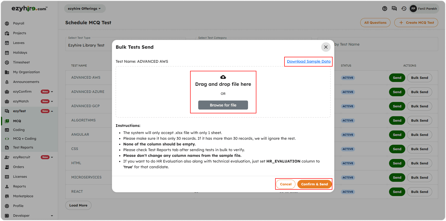 To send the same test to multipal candidate at the same time use the bulk upload button, one in the bulk upload window download the sample Exel file and fill out the details in the given format and then upload the file back then click on confirm and send button.
